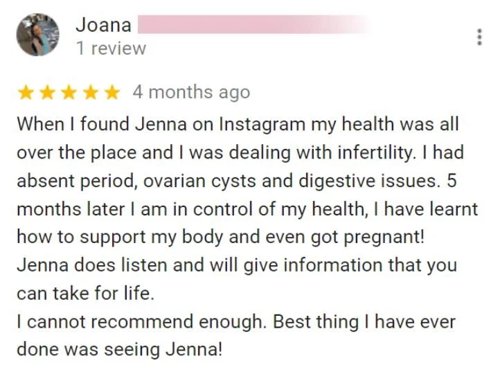 I’m happy to say that after 6 months of working together, I have lost 15 pounds, have way more energy, and my periods have been virtually pain free! I still have some more work to do to begin ovulating regularly, but the path Jenna has set me on has me feeling 1000% better already.